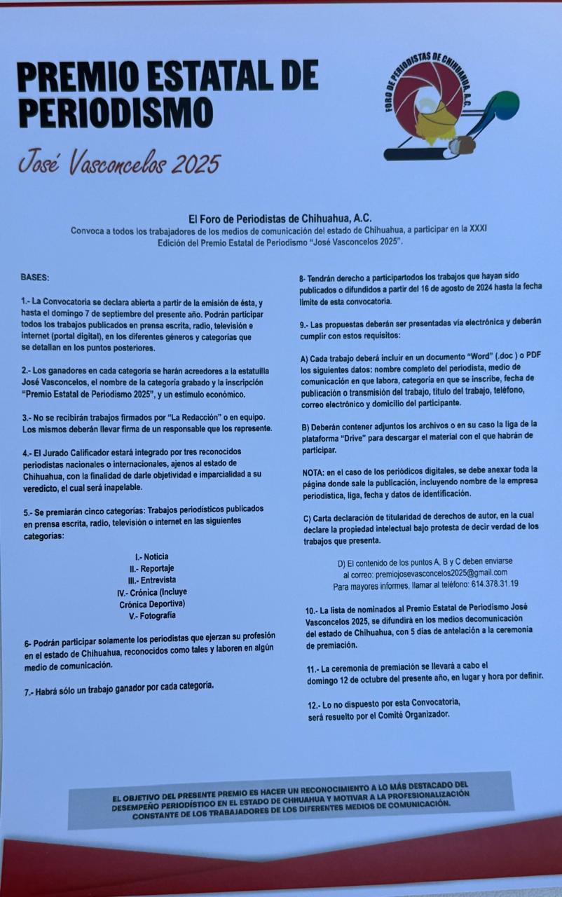 El Foro de Periodistas de Chihuahua, A.C. lanzó en rueda de prensa la convocatoria para la XXXI edición del Premio Estatal de Periodismo “José Vasconcelos 2025”, que reconoce lo más destacado del quehacer periodístico en la entidad e impulsa la profesionalización del gremio.